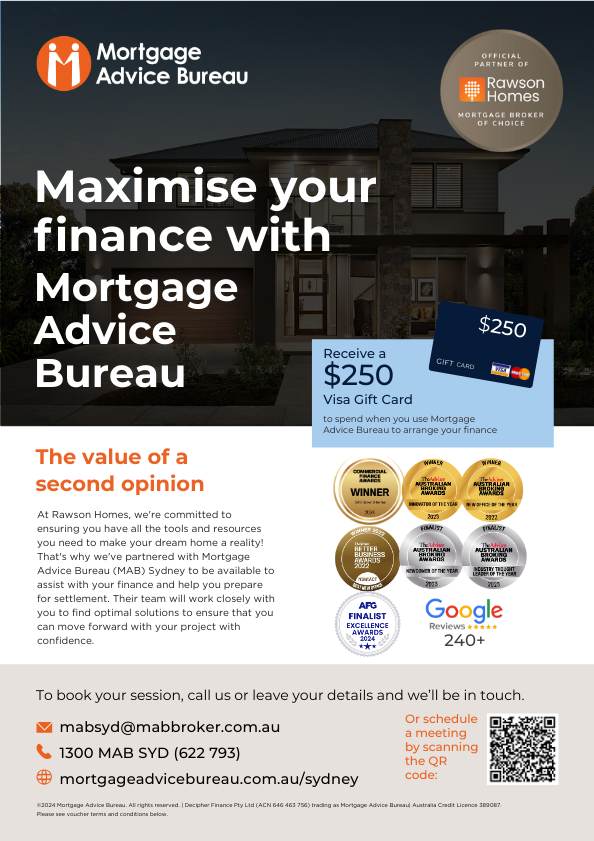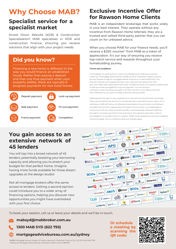 As Rawson Home's recommended finance partner, we are committed to equipping you with the essential tools and support needed to transform your dream home into a tangible reality! We are here to provide assistance with your financial requirements and streamline your application through to settlement. Our team will work closely with you to find optimal solutions to ensure that you can move forward with your project with confidence.